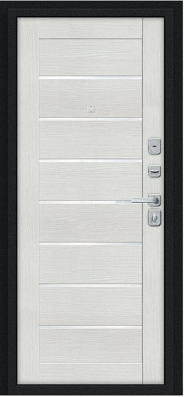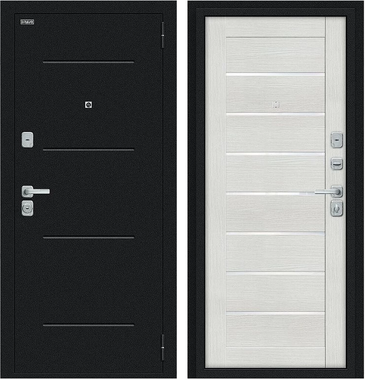 Надежная входная Дверь Браво Техно/BChrome Букле черное/Bianco Melinga премиум класса по цене 34 867 руб. Большая толщина стали защитит от проникновения в ваш дом, квартиру или коттедж. Используется очень качественная фурнитура: замки, цилиндры, ручки, защелки. Покрытие и отделка двери изготовлено под внимательным контролем производителя. Дверь имеет долгий срок службы и гарантию.